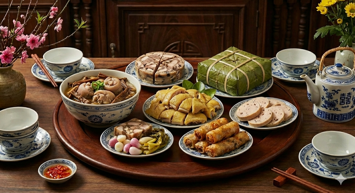 Mâm cỗ Tết miền Bắc luôn giữ được sự chỉn chu, mang đậm nét truyền thống với những món ăn đặc trưng. Giữa cái se lạnh của tiết trời xuân Hà Nội, những món ăn như bánh chưng xanh, thịt đông, dưa hành, nem rán hay bát canh măng khô không chỉ làm ấm lòng người xa xứ mà còn gợi nhắc về một nền văn hóa kinh kỳ ngàn năm văn hiến.