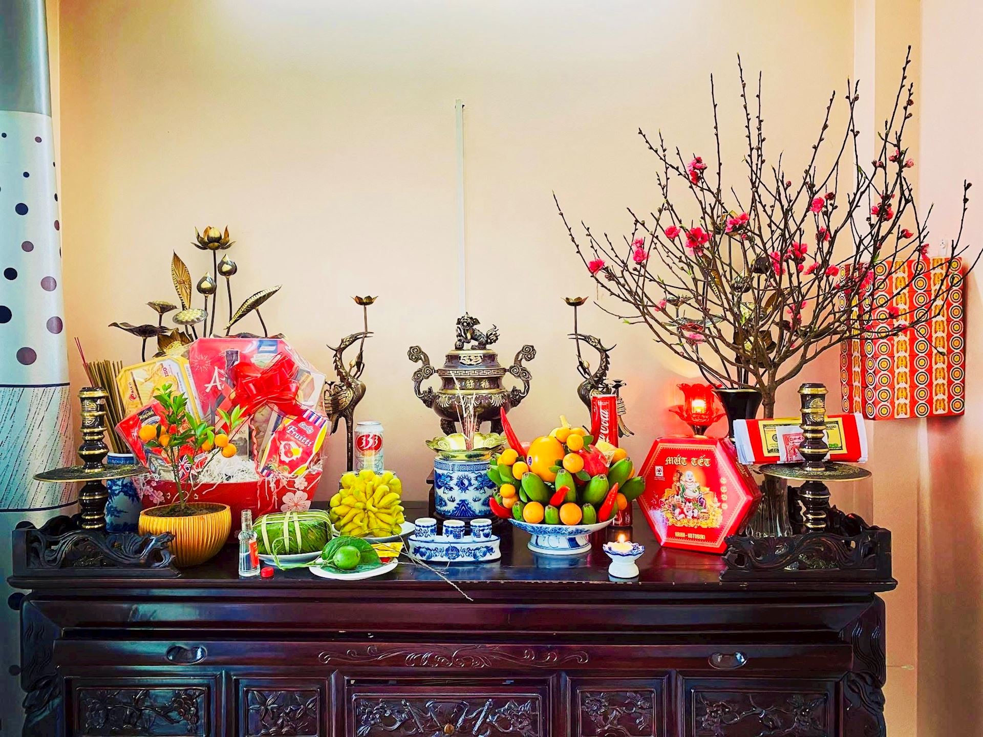 Mâm lễ Tết với hoa quả, bánh kẹo và các loại đồ uống thể hiện nét đẹp trong văn hóa thờ cúng của người Việt.