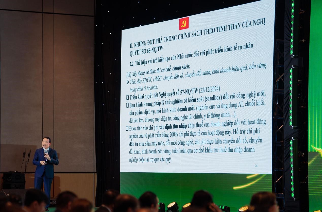 Tại Diễn đàn VCSF 2025 diễn ra vào 22/8 vừa qua, ông Nguyễn Hồng Sơn, Phó Trưởng Ban Chính sách, Chiến lược Trung ương, nhấn mạnh: “Trong Nghị quyết số 68 khẳng định kinh tế tư nhân là một động lực quan trọng nhất của nền kinh tế quốc gia và khu vực kinh tế tư nhân thì phải đóng vai trò tiên phong trong tăng trưởng, tạo việc làm, nâng cao năng suất lao động, năng lực cạnh tranh quốc gia, công nghiệp hóa, hiện đại hóa, tái cấu trúc nền kinh tế theo hướng xanh, tuần hoàn và bền vững.”