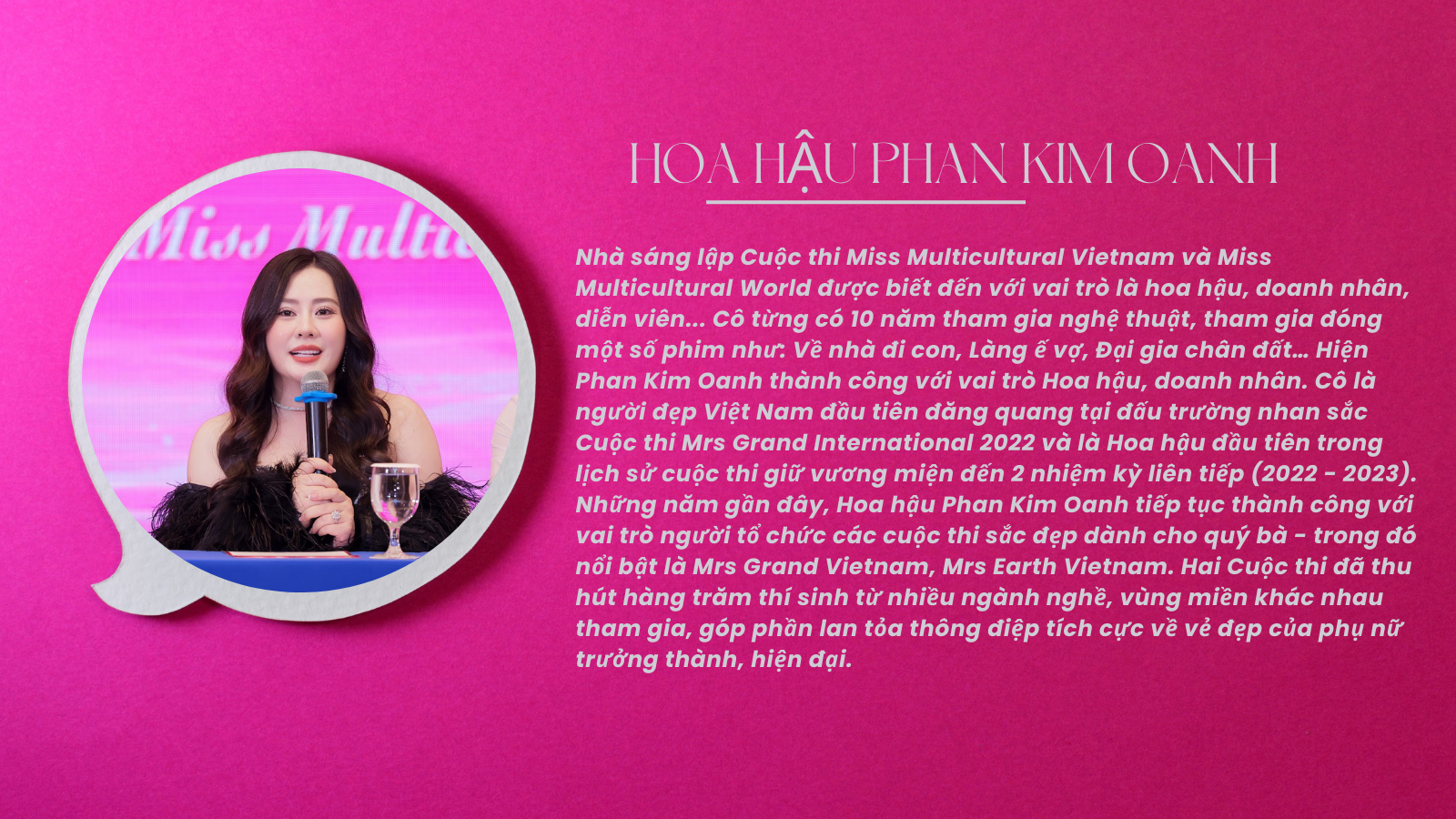 Phát biểu tại buổi Họp báo mới đây, Hoa hậu Phan Kim Oanh – Chủ tịch kiêm Nhà sáng lập Miss Multicultural Vietnam và Miss Multicultural World cho biết: “Hoa hậu Văn hóa Việt Nam không chỉ tôn vinh nét đẹp hình thể, mà còn mở ra một hành trình lan tỏa giá trị văn hóa dân tộc. Đây là nơi hội tụ của những cô gái hiện đại – bản lĩnh, đạo đức, trí tuệ và giàu lòng tự hào với bản sắc Việt. Thông qua các vòng thi, những giá trị truyền thống quý báu sẽ được gìn giữ và quảng bá rộng rãi đến cộng đồng trong nước và quốc tế.”