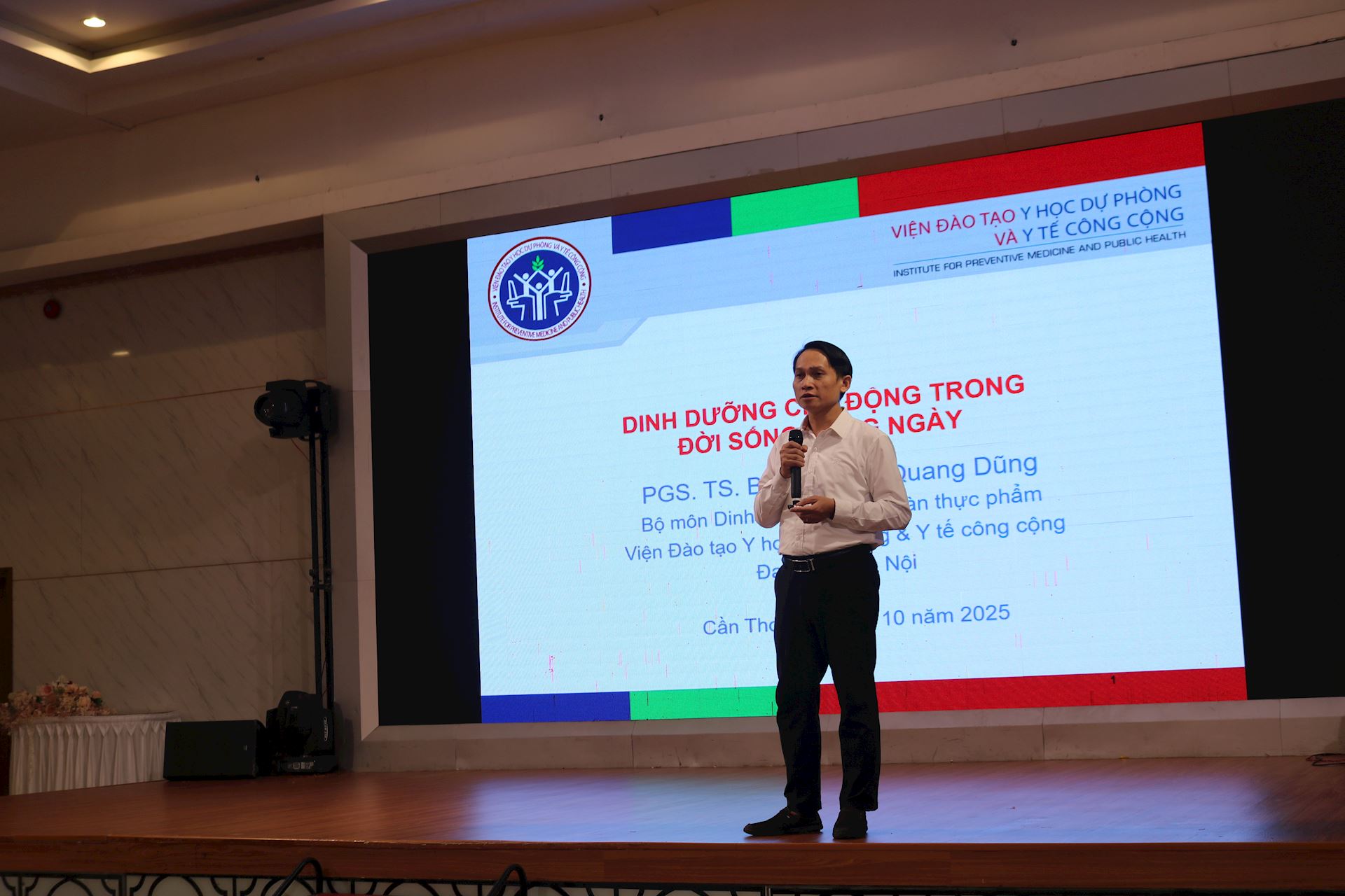 Một trong những nội dung thu hút sự quan tâm là bài thuyết trình của PGS. TS. BS. Nguyễn Quang Dũng – Bộ môn Dinh dưỡng và An toàn thực phẩm, Đại học Y Hà Nội. Ông giải thích rõ hơn về vai trò của từng chất dinh dưỡng thiết yếu, tập trung hơn vào vấn đề cân nặng của cơ thể đặc biệt là mối quan hệ với bệnh thừa cân béo phì (TCBP). Dinh dưỡng chủ động là việc mỗi cá nhân hiểu rõ nhu cầu dinh dưỡng, trạng thái sức khỏe của bản thân, và chủ động điều chỉnh chế độ ăn – hoạt động thể lực – giấc ngủ – kiểm soát cân nặng – thói quen sống để đạt sức khỏe tối ưu và từ đó, đưa ra những lời khuyên dinh dưỡng hợp lý.