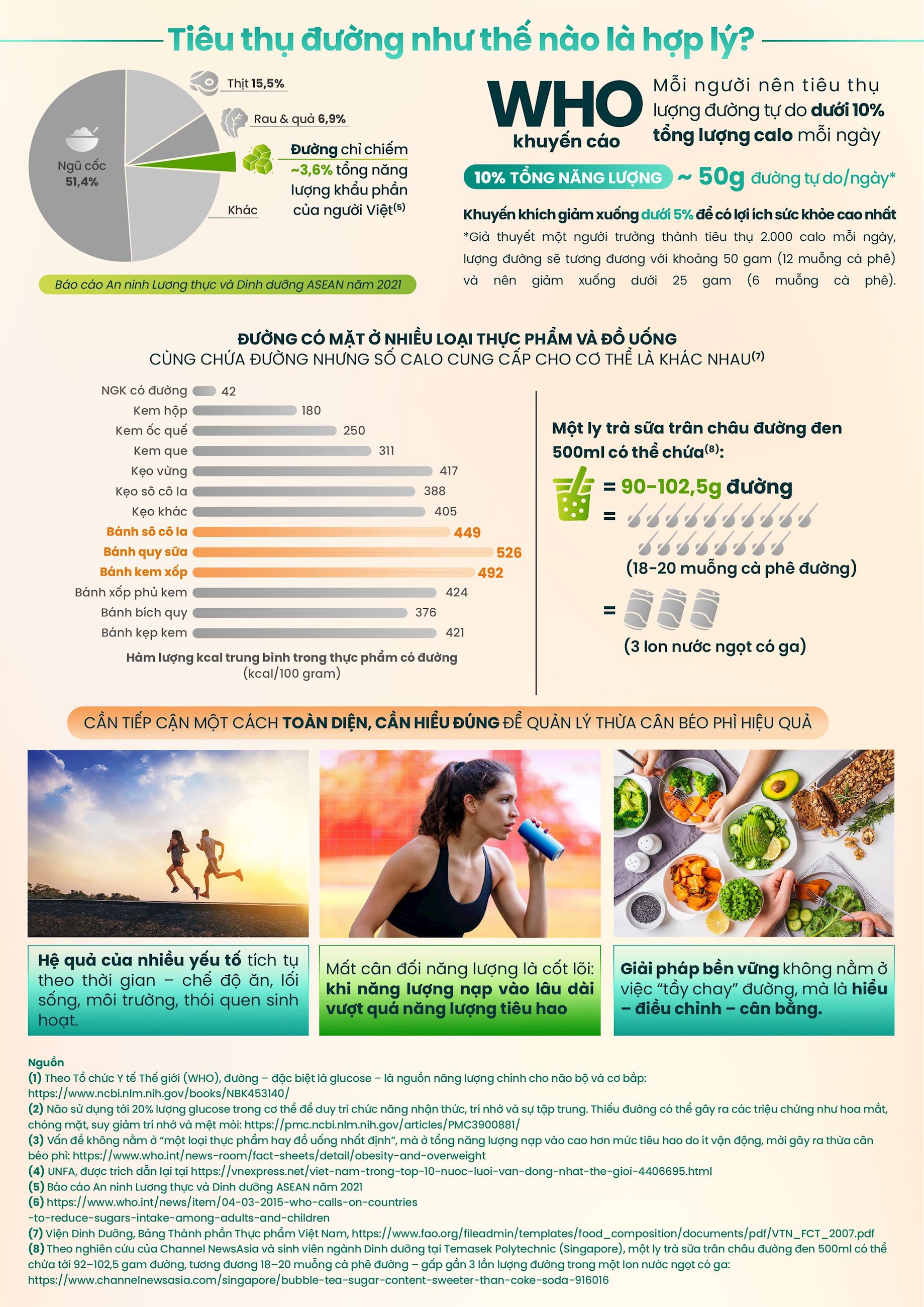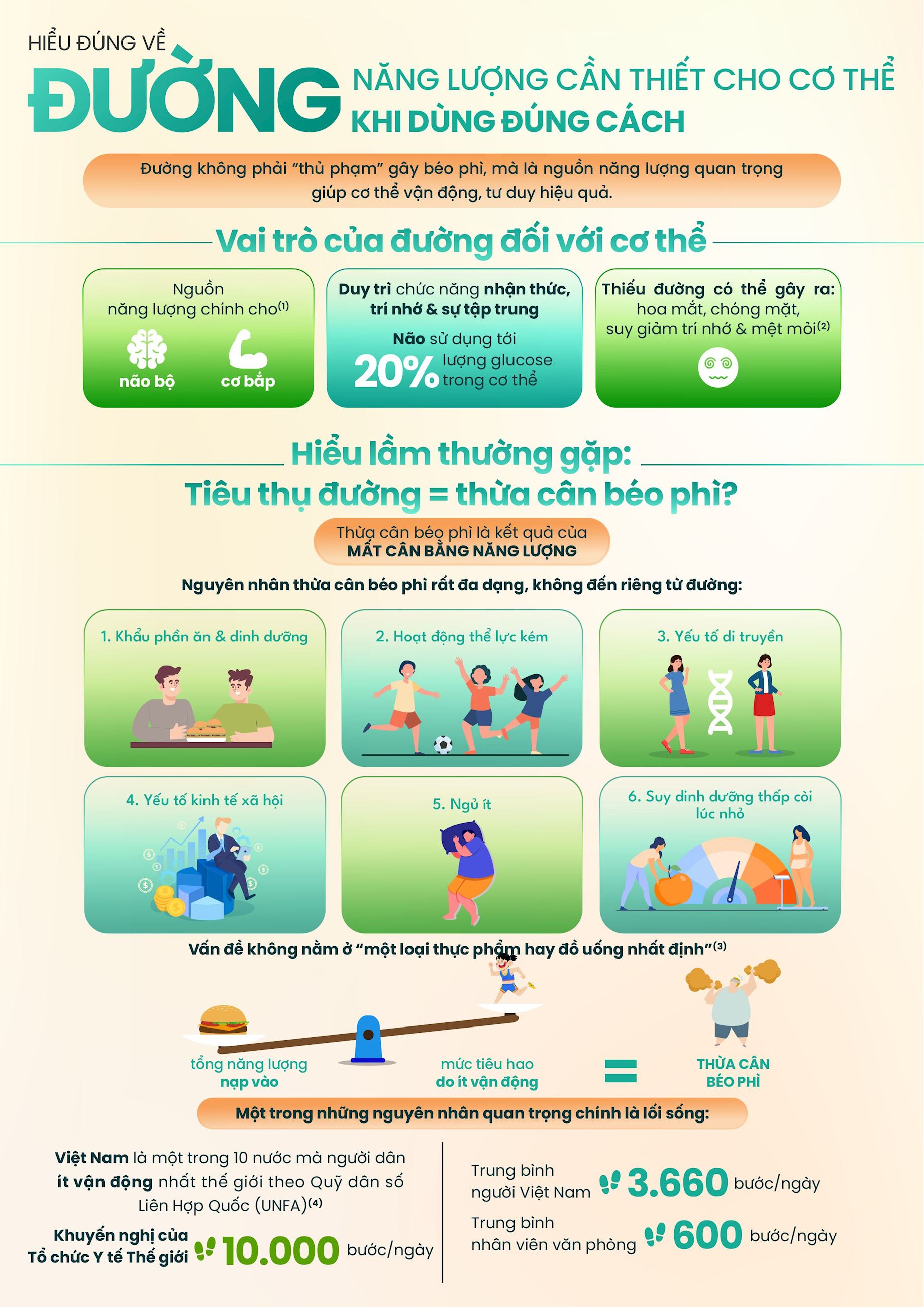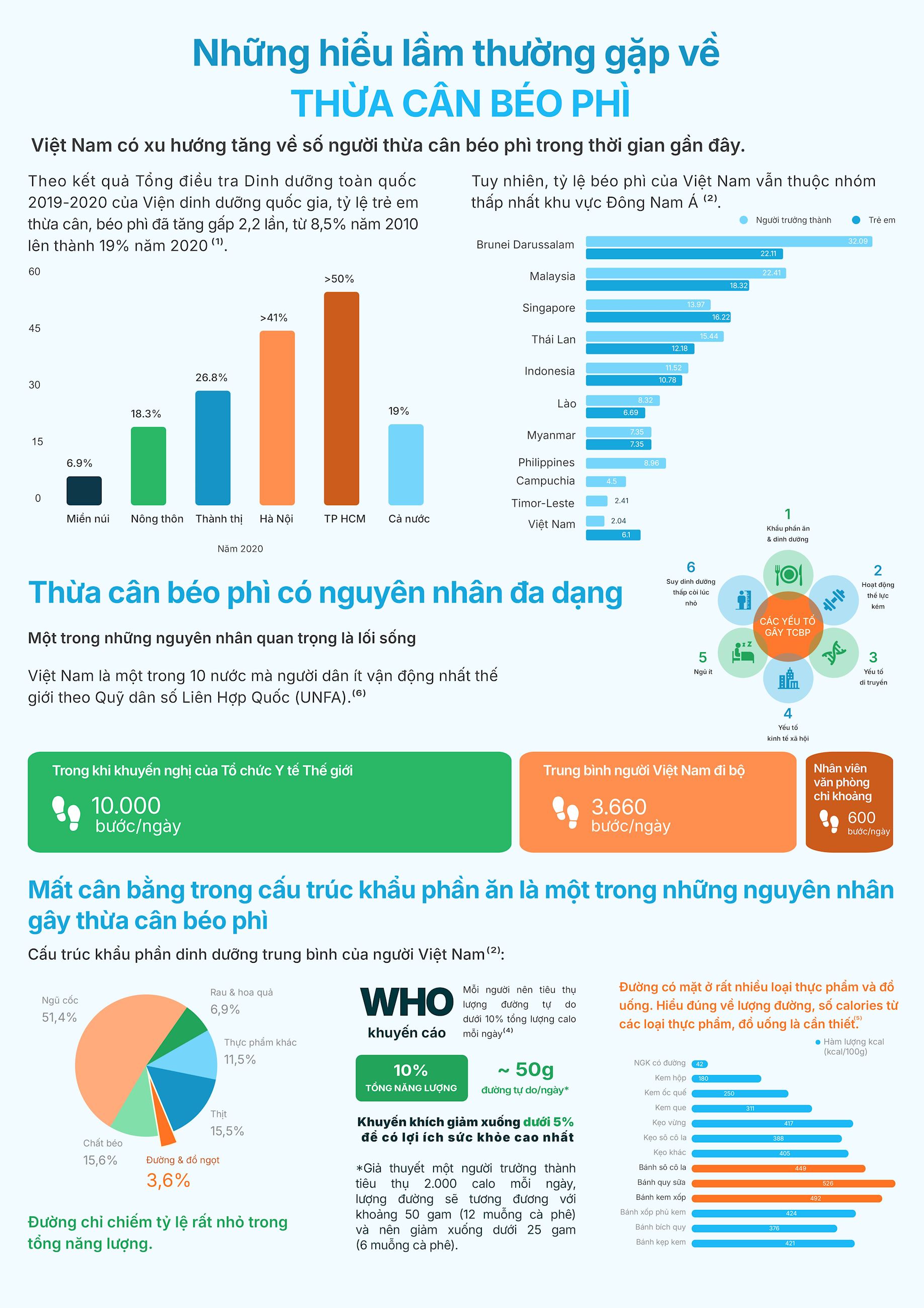 Đáng chú ý, đường chỉ chiếm khoảng 3,6% tổng năng lượng khẩu phần ăn trung bình của người Việt Nam. Trong khi đó, Việt Nam là một trong 10 nước mà người dân ít vận động nhất thế giới theo Quỹ Dân số Liên Hợp Quốc. Trung bình người Việt chỉ đi bộ 3.660 bước/ngày.