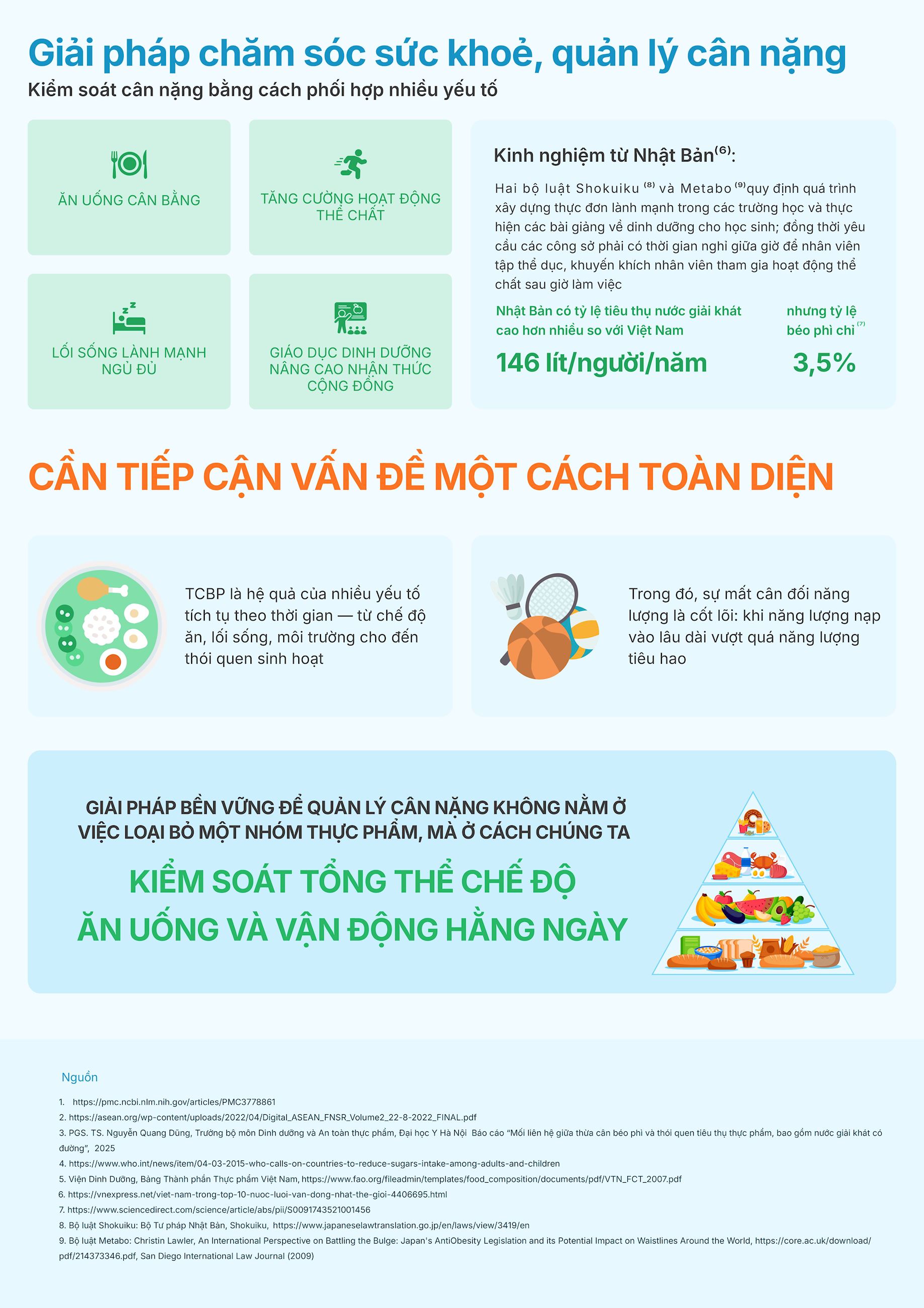 Về vấn đề TCBP, đến từ nhiều nguyên nhân như dư năng lượng nạp vào, hoạt động thể lực ít, giấc ngủ, yếu tố môi trường, và yếu tố sinh học cá nhân (tuổi, di truyền, nội tiết). Đường không phải là thủ phạm duy nhất gây TCBP mà năng lượng dư thừa mới là cốt lõi. Béo phì là bệnh của hệ thống lối sống, không phải của một loại thực phẩm. Hiện tại, chưa có bằng chứng nhất quán về mối liên hệ giữa đồ uống có đường và TCBP.