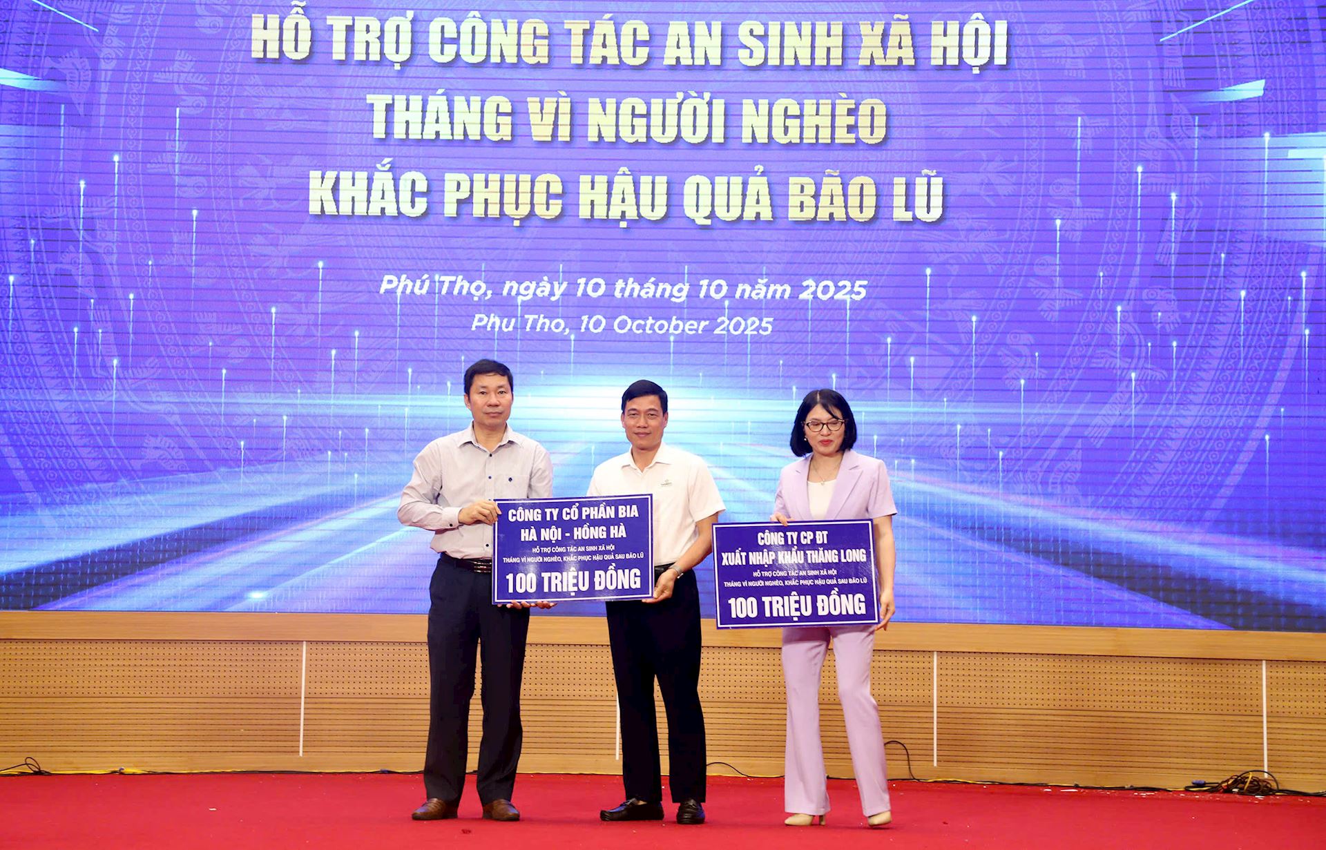 Nhân dịp này, Hiệp hội Doanh nghiệp tỉnh Phú Thọ cũng công bố kết quả vận động ủng hộ công tác an sinh xã hội nhân Tháng vì người nghèo và khắc phục hậu quả bão số 10, số 11 vừa qua, với tổng số tiền và hiện vật tính đến ngày 9/10/2025 đạt trên 5 tỷ đồng. Trong đó, Công ty Cổ phần Xi măng Hoàng Long ủng hộ 500 tấn xi măng (tương đương 556 triệu đồng), Công ty Cổ phần Bia Hà Nội – Hồng Hà ủng hộ 100 triệu đồng, Công ty Cổ phần Đầu tư Xuất nhập khẩu Thăng Long ủng hộ 100 triệu đồng…