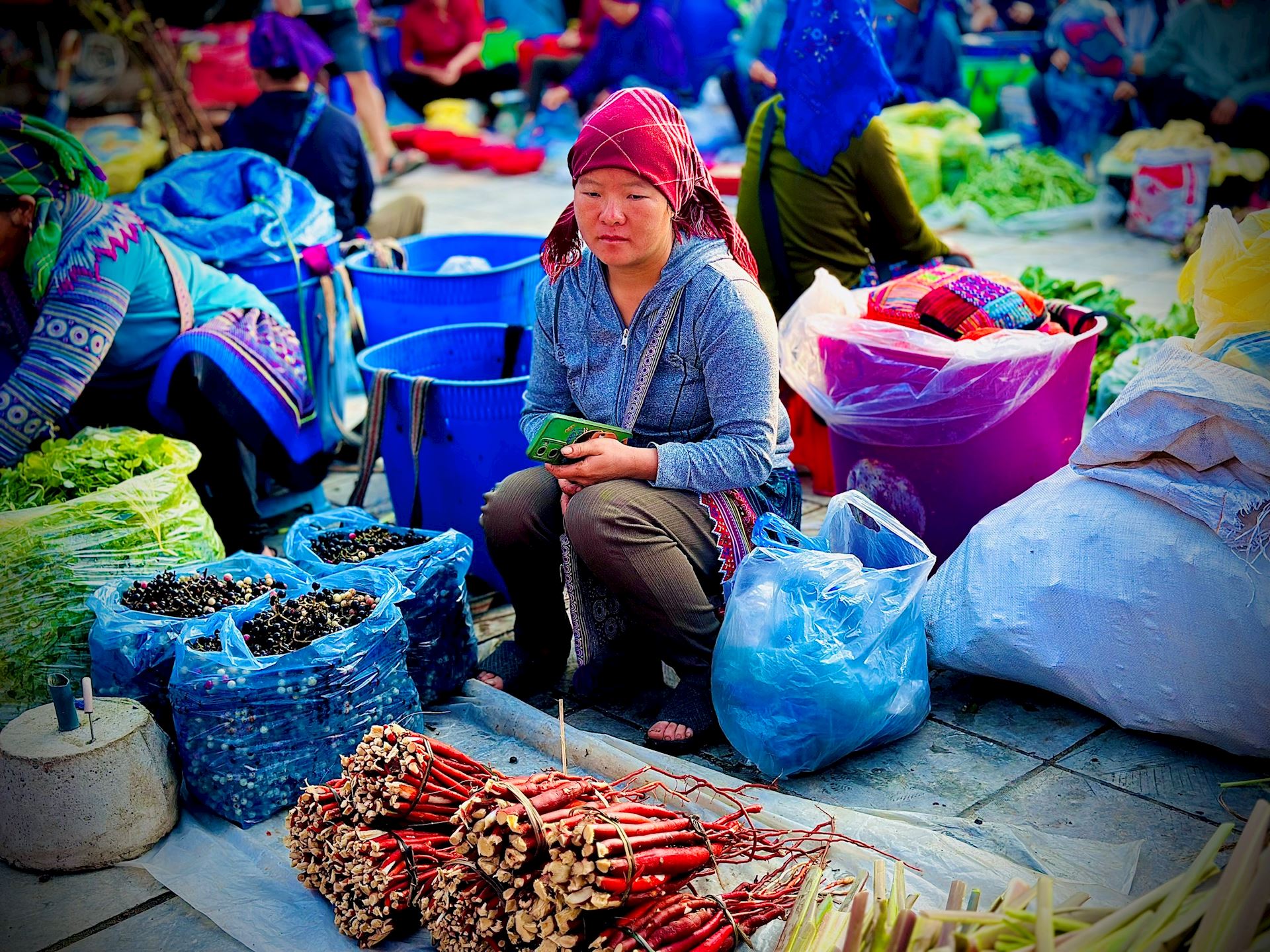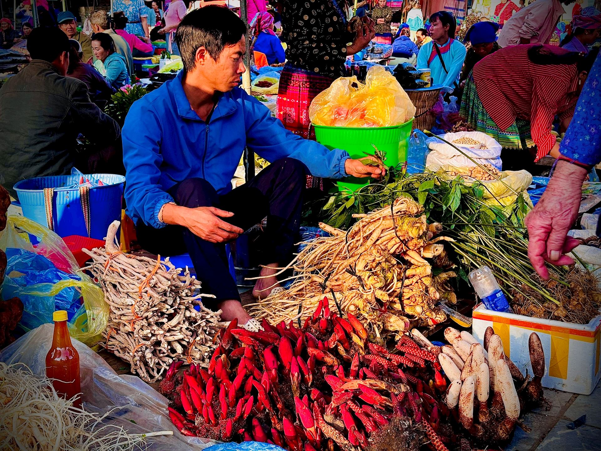 Người dân vùng cao mang theo dược liệu rừng đến chợ phiên Bắc Hà trao đổi, mua bán.