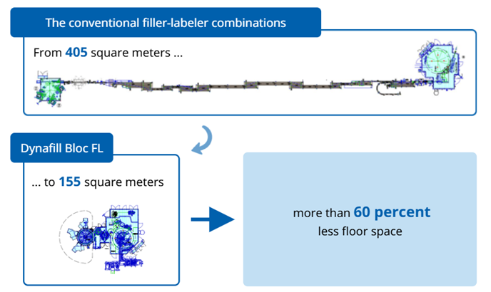 Nhưng chúng ta hãy quay lại khối máy Dynafill Bloc FL và xem xét kỹ hơn diện tích lắp đặt của khối máy. Trong khi thiết kế dây chuyền chiết thông thường cho máy chiết rót, máy đóng nắp và máy dán nhãn chiếm 405 mét vuông diện tích lắp đặt thì ý tưởng khối máy mới này khớp với diện tích lắp đặt chỉ 155 mét vuông. Điều đó có nghĩa là tiết kiệm được hơn 60% đối với cùng công suất chiết rót danh định 60.000 chai mỗi giờ.