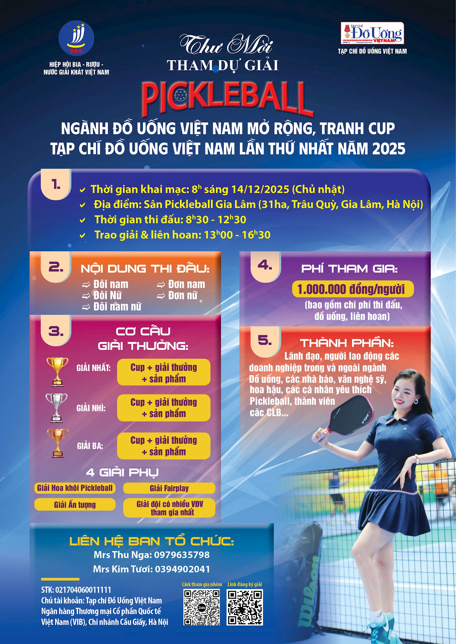 Hưởng ứng phong trào “Toàn dân rèn luyện thân thể theo gương Bác Hồ vĩ đại” và thúc đẩy tinh thần thể thao trong cộng đồng doanh nghiệp, Tạp chí Đồ Uống Việt Nam sẽ tổ chức “Giải Pickleball Ngành Đồ uống Việt Nam mở rộng, tranh Cúp Tạp chí Đồ Uống Việt Nam lần thứ nhất năm 2025” vào 8h00 ngày 14/12/2025 tại Cụm sân Pickleball Gia Lâm (31ha Trâu Quỳ, Gia Lâm, Hà Nội).